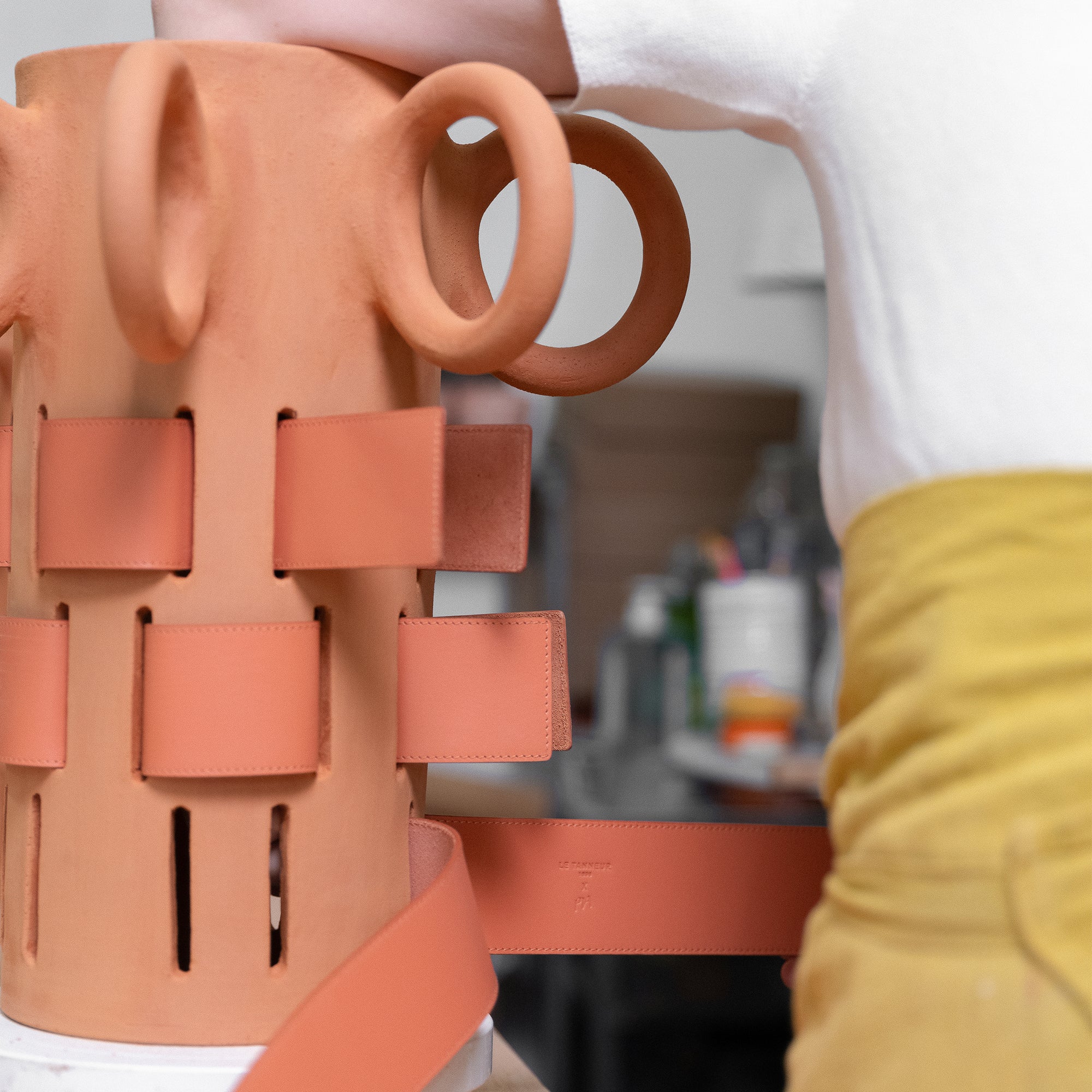 Seit seiner Werkstatt, nur wenige Schritte von der Hauptstadt entfernt, entwickelt der Künstler einen experimentellen Ansatz in der Keramikbearbeitung, einem Material, das in Kombination mit Leder besonders förderlich für die Kreativität ist.