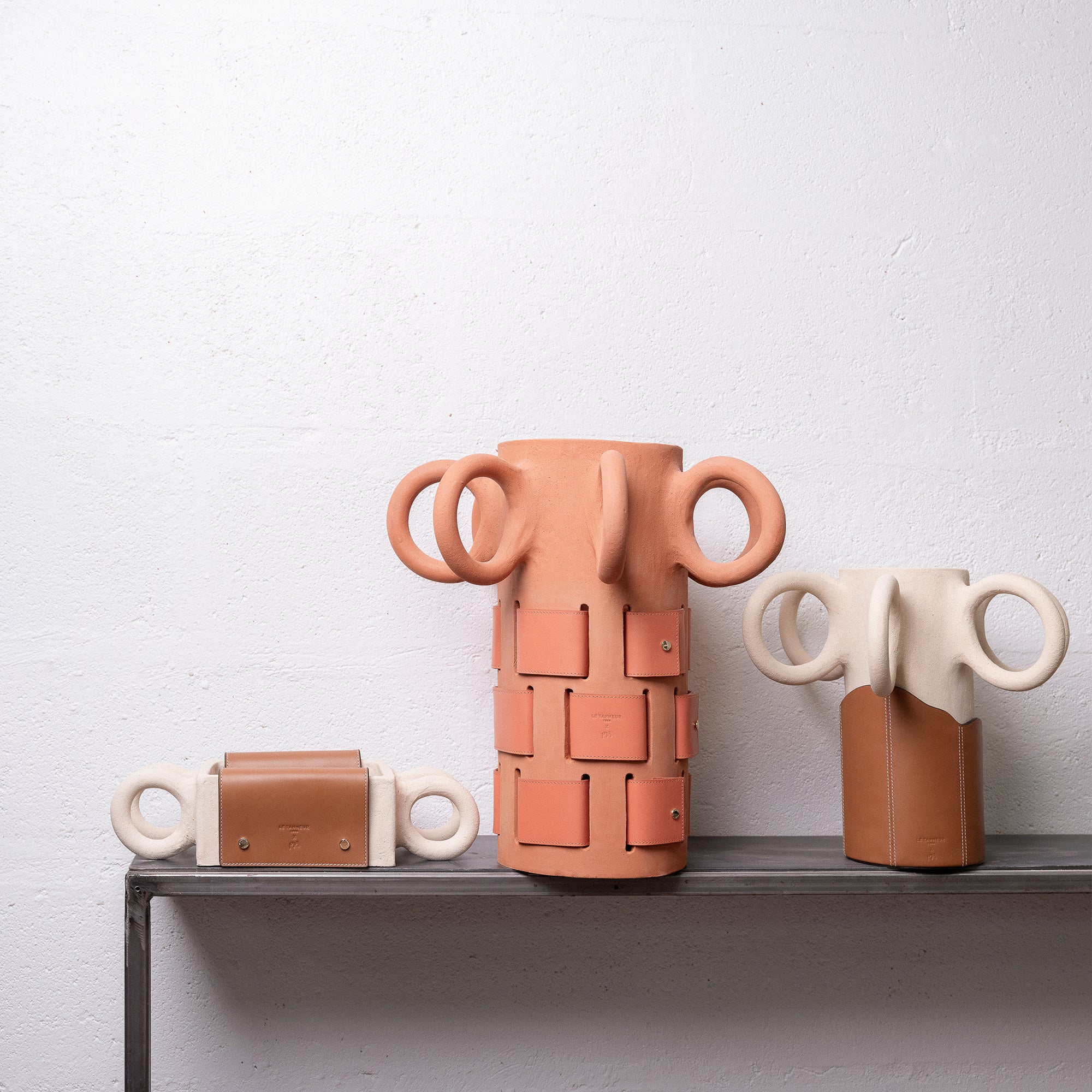 Seit seiner Werkstatt, nur wenige Schritte von der Hauptstadt entfernt, entwickelt der Künstler einen experimentellen Ansatz in der Keramikbearbeitung, einem Material, das in Kombination mit Leder besonders förderlich für die Kreativität ist.