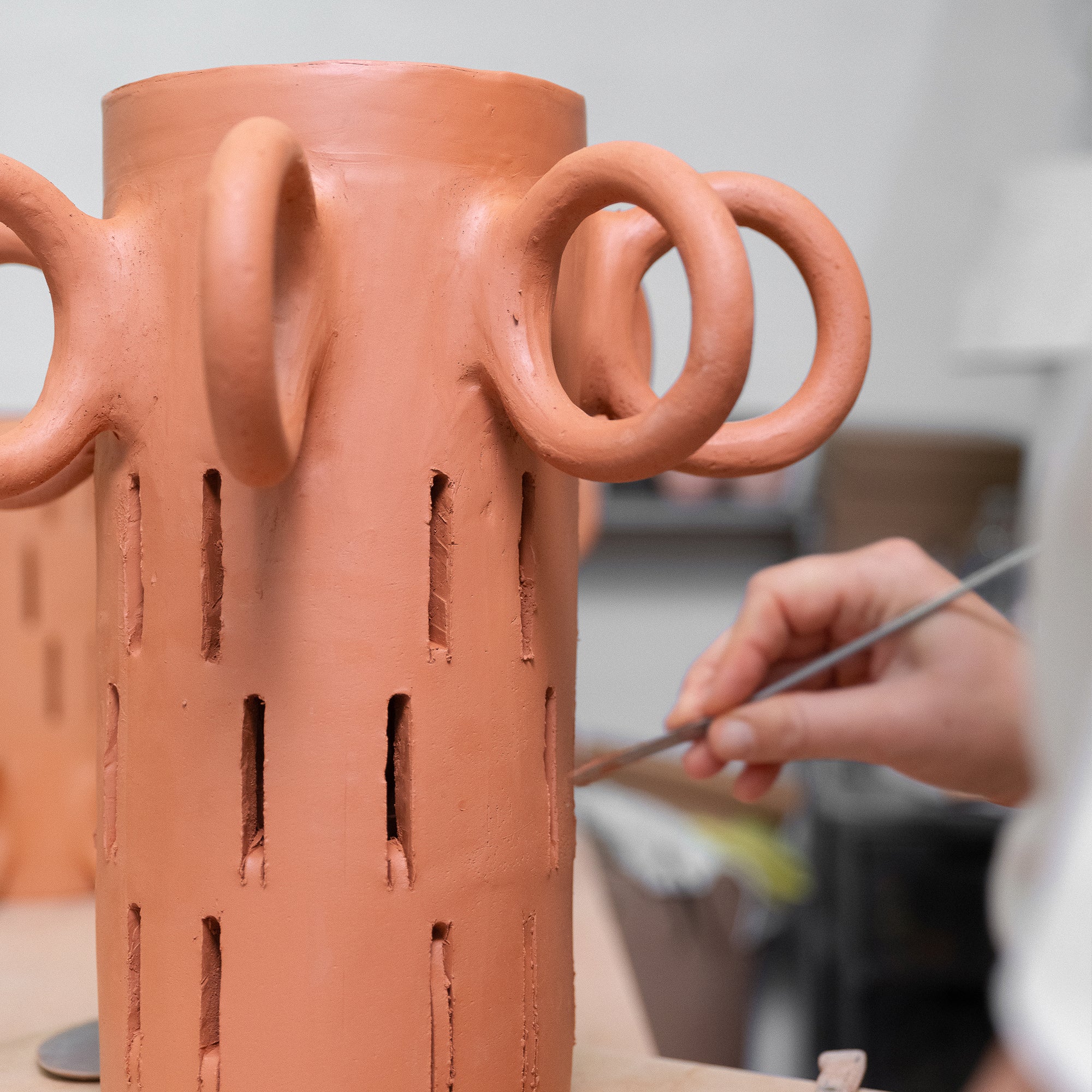 Was mich zu Ton und Keramik hingezogen hat, ist vor allem die Freiheit des Ausdrucks, die dieses Material bietet. Ich habe nie gelernt, wie man modelliert, dreht und formt. Ich habe einen sehr intuitiven Arbeitsansatz, bei dem meine Überlegungen in erster Linie auf das Material ausgerichtet sind.